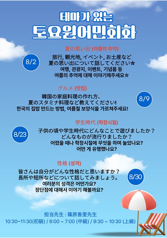 ♪~ 8월 토요 원어민 회화 수업 ~♪ 아사히일본어전문학원 25-07-30 22:25 287 0 ♪~ 8월 토요 원어민 회화 수업 ~♪ 댓글목록 등록된 댓글이 없습니다. 이전 목록 다음