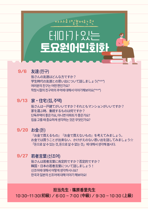 ♪~ 9월 토요 원어민 회화 수업 ~♪ 아사히일본어전문학원 25-09-04 22:11 265 0 ♪~ 9월 토요 원어민 회화 수업 ~♪ 댓글목록 등록된 댓글이 없습니다. 이전 목록 다음