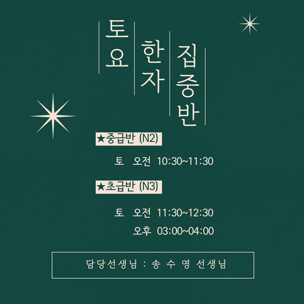▷▶ 2026년 상반기 토요 한자 집중반 시간표 ◀◁ 아사히일본어전문학원 25-12-07 20:55 17 0 ▷▶ 2026년 상반기 토요 한자 집중반 시간표 ◀◁ 댓글목록 등록된 댓글이 없습니다. 이전 목록