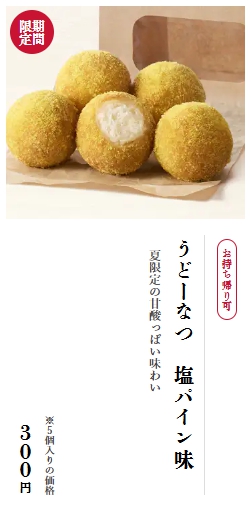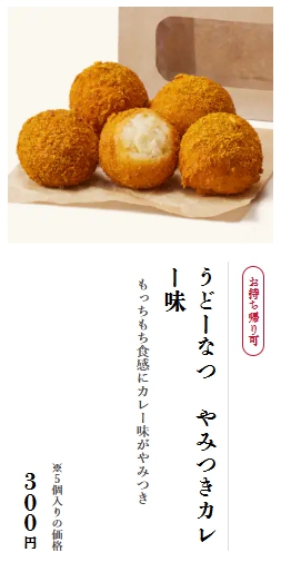 한입 크기이므로 먹기 편하고, 조금 출출한 배를 채우고 싶을 때 딱 좋습니다. 식후 디저트로도 OK. 봉투로 구입할 수 있으므로 테이크 아웃하기 쉽고 찍어 먹을수 있도록 꼬치도 주기 때문에 구입 즉시 먹을 수 있습니다. NEW 스타일의 우동을 느껴보세요!