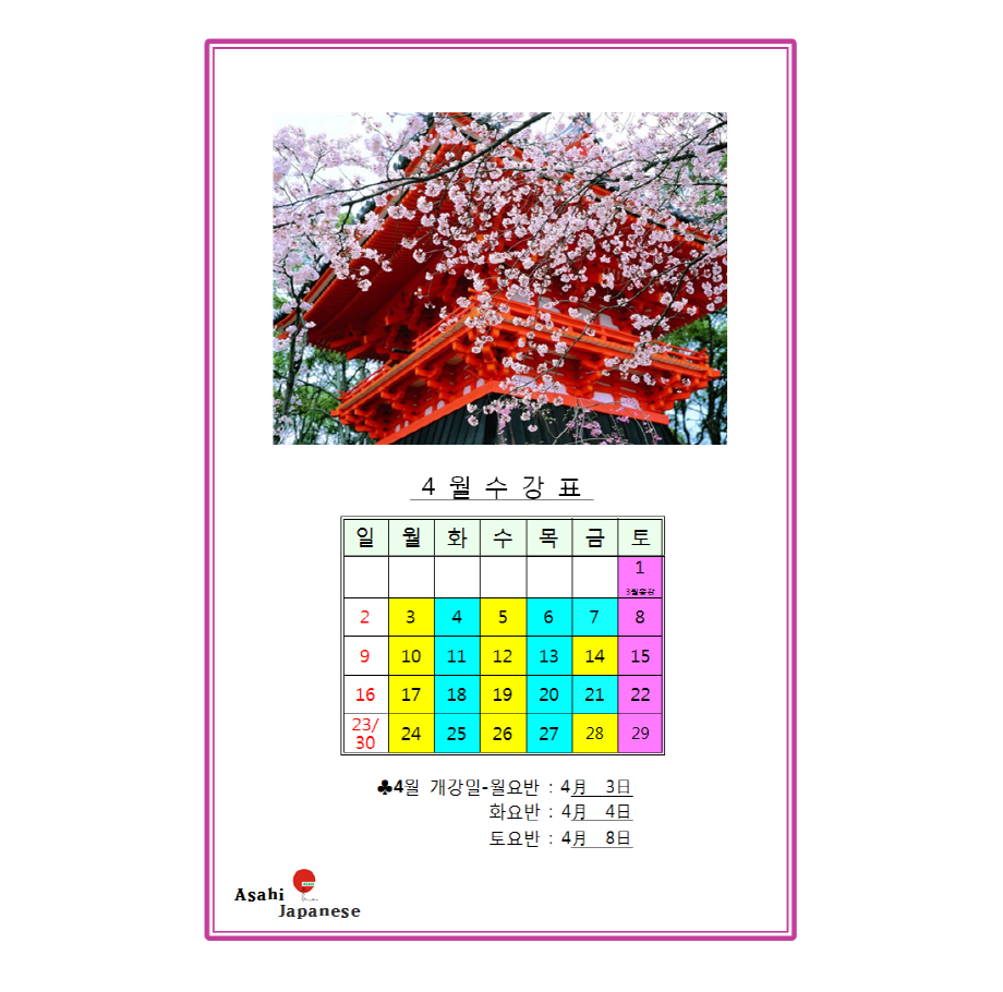 4월 수강표입니다.